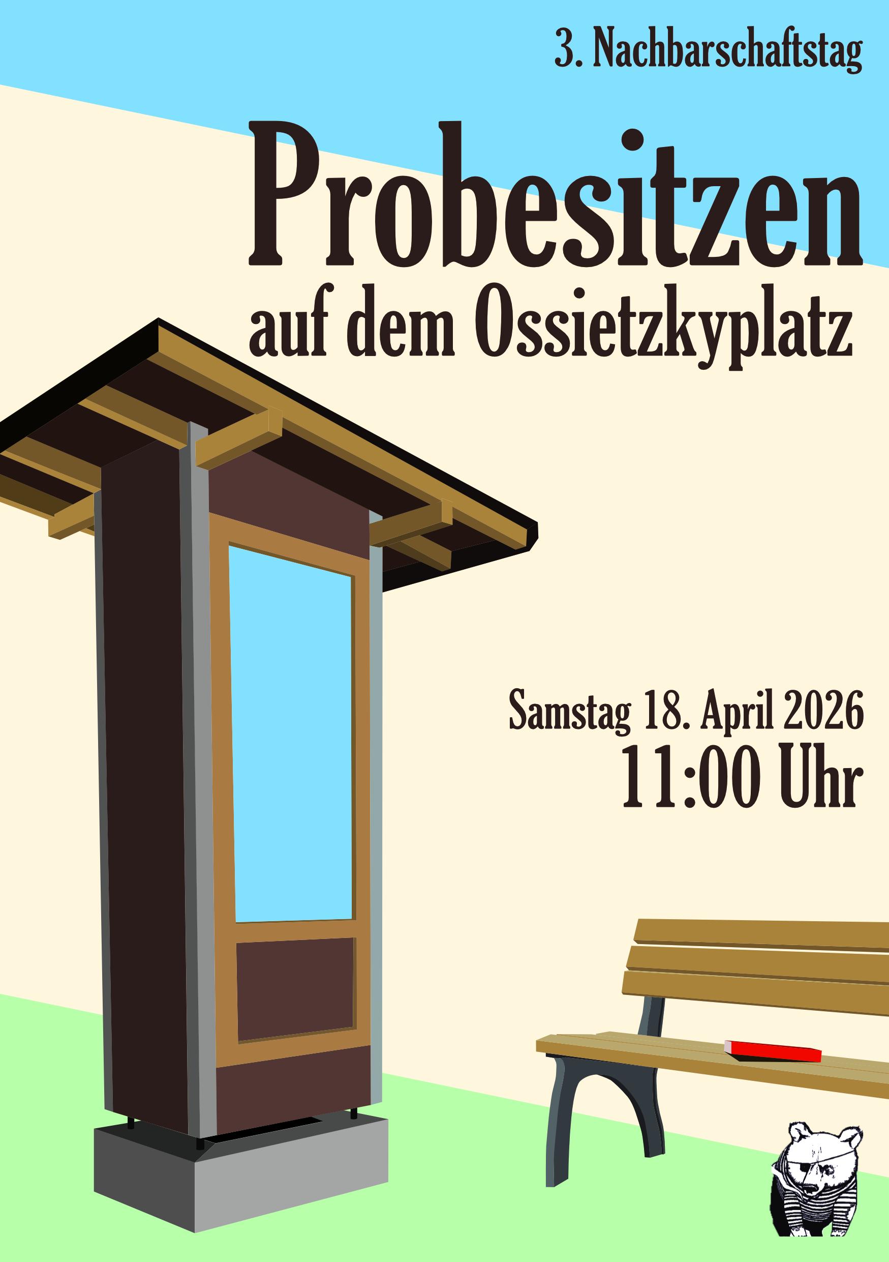 Der Ossietzky-Platz wird endlich mit neuen Bänken ausgestattet! Damit geht ein lang gehegter Wunsch der Anlieger_innen in Erfüllung. Nachdem im vergangenen Jahr der Bücherschrank, die Tischtennisplatte und ein neuer Baum den Platz bereits angenehmer machten, folgen nun neue Bänke. Deshalb laden Anwohner_innen und das „Trotz Allem“ zum Probesitzen ein. Die neuen Bänke sind bequemer als die alten und laden dazu ein, sich auf dem Platz zum Plausch zu treffen. Es wird Waffeln, Kuchen und Kaffee geben und wenn dann schon mal ein paar Leute da sind, wollen wir den Platz auch säubern. Harken, Müllzangen und Platiksäcke liegen bereit.
